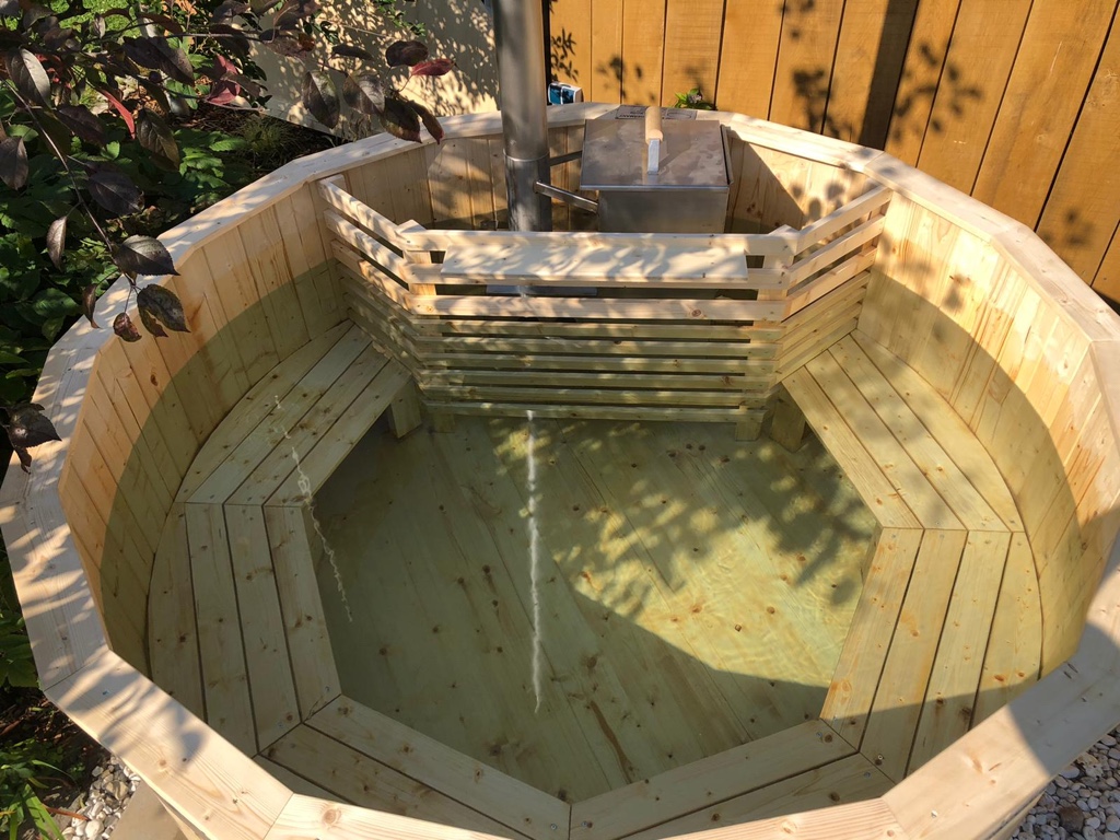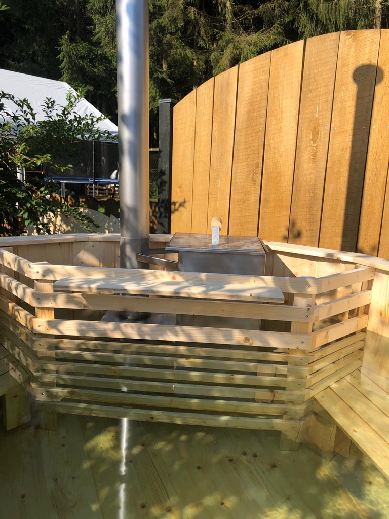 Dank der massiven 4 cm starken Bohlen ist der Badezuber besonders stabil und langlebig. Der kraftvolle 27 kW Ofen sorgt für eine schnelle und angenehme Erwärmung des Wassers – perfekt für gemütliche Abende unter freiem Himmel.